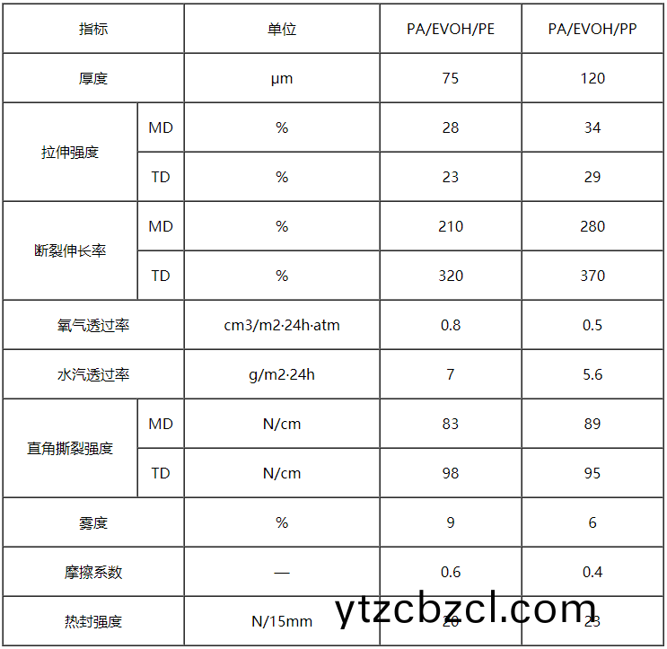 PA/EVOH/PE:能耐(nai)100℃以下(xia)水(shui)煑(zhu),可用作(zuo)高阻隔(ge)真空包裝、肉製品包裝(zhuang)。